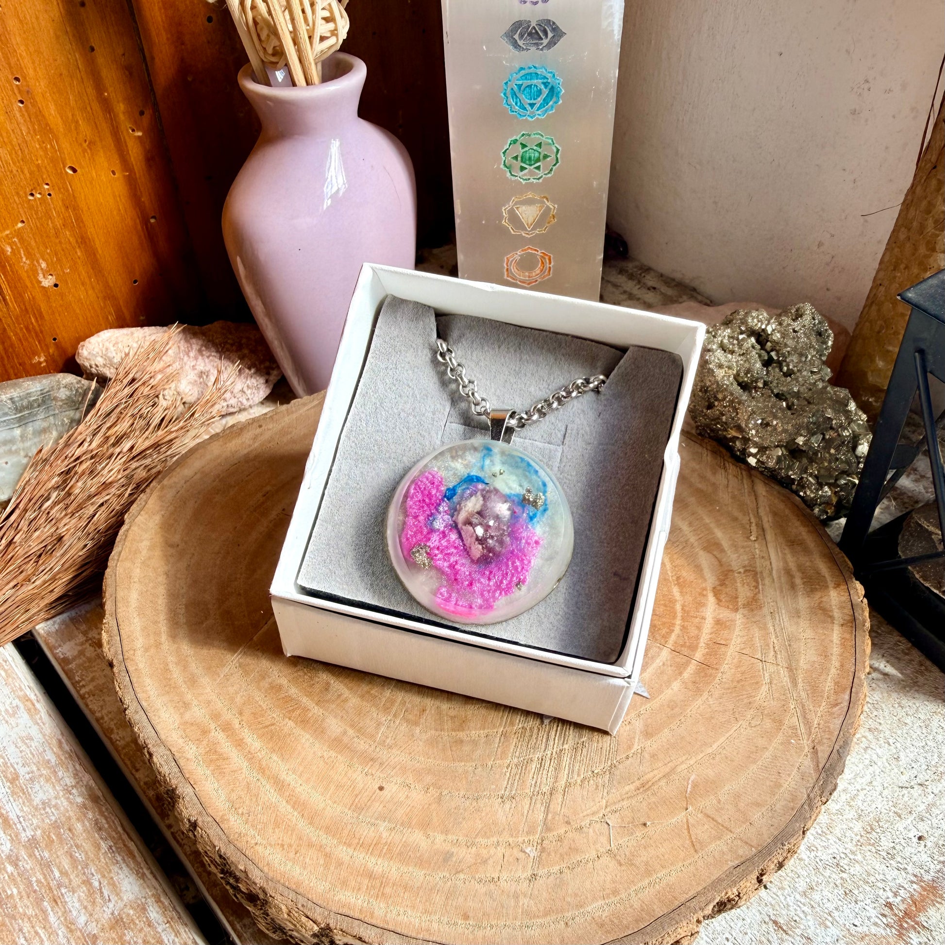 Esta pieza contiene Lepidolita sus vibraciones unen la mente con el corazón, conectando nuestros pensamientos con las emociones. Logra activar tanto la glándula pineal como la glándula del timo conectándonos con nuestra esencia y haciendo un puente entre la lógica y la intuición. Tiene un efecto calmante y relajante sobre el cuerpo físico aliviando tensiones y reduciendo el estrés.